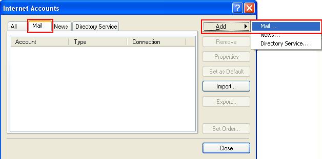 A box will open with the list of set up accounts in your Outlook Express. Click on Add and select the item Mail...