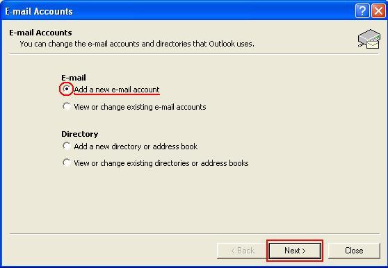A setup wizard to create a new e-mail account will open. Select Add a new e-mail account and click Next to continue.
