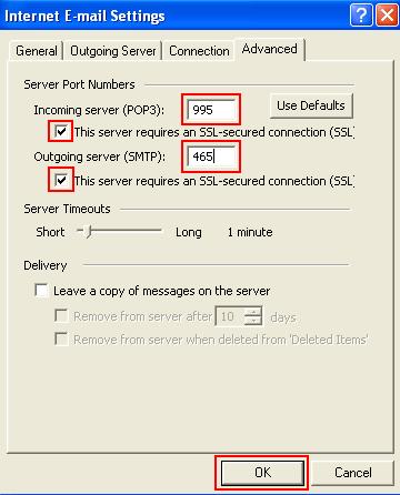 On the same menu, click on the last item on the taskbar: Advanced. Select SSL-secured connection for both the incoming and outgoing mail servers. Ports need to be changed to the following: